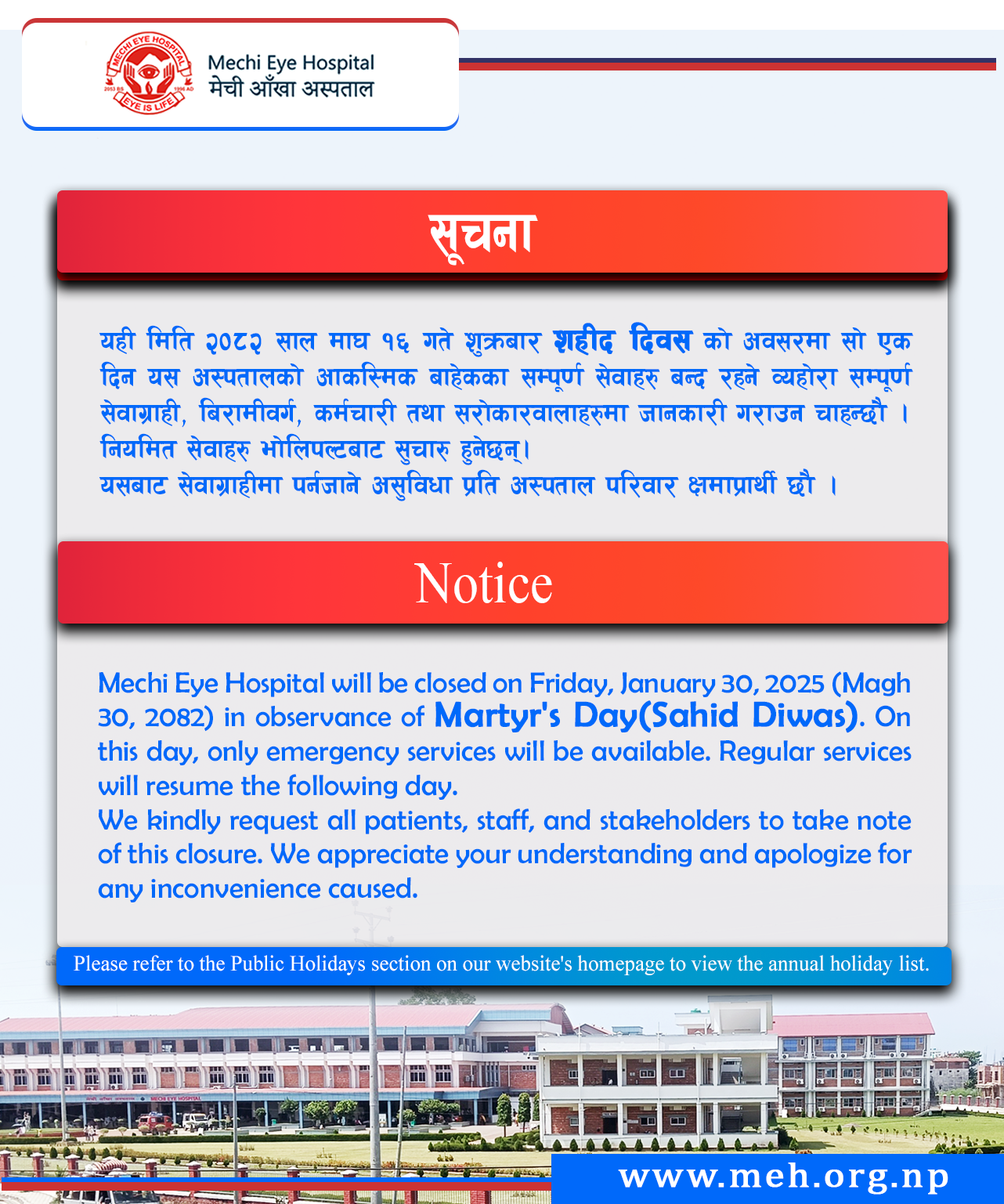 Maha Shivaratri Holiday Notice (New)(Feb 15,2026) Shahid Diwas Holiday Notice Makar Sangranti Holiday Notice National Unity Day Holiday Important Notice ! Regarding Disruption of Regular Services Tihar(Dipawali) and Chhath Parva Holiday Notice-New Dashain ( Bijaya Dashami, Durga Puja) Holiday Notice Ghatasthapana Holiday Notice- New Sambidhan Diwas Holiday Notice- New Unregistered social media platforms has been banned in Nepal. Notice for Eye Screening Camp/Surgical Eye Camp Invitation for Sealed Quotation (13 June 2025) Attention: Important Notice Ganatantra Diwas(Republic Day) Holiday Notice Buddha Jayanti Holiday Notice International Labour Day Holiday Notice New Year 2082 BS Holiday Notice Holi (Fagu Purnima) Holiday Notice Maha Shivaratri Holiday Notice बीमा बाट प्रदान हुने सम्पूर्ण सेवाहरु सुचारु भएको जानकारी बीमा बाट प्रदान हुने सम्पूर्ण सेवाहरु अवरुद्ध रहेको जानकारी Sahid Diwas Holiday (Martyr's Day) Notice- New (January 29,2025) Makar Sangranti Holiday Notice Chhath Puja Holiday Notice Tihar ( Dipawali) Holiday Notice Bijaya Dashami ( Dashain ) ( Durga Puja ) Holiday Notice Ghatasthapana Holiday Notice Constitution Day Holiday Notice Shree Krishna Janmasthami Holiday Notice Janai Purnima & Rakshya Bandhan Holiday Notice Invitation for Sealed Quotation (June 19,2024) Notice Related to Eye Screening Camp/ Surgical Camp Buddha Jayanti Holiday ( May 23,2024) International Labour Day Closure Border Closure Notice to Foreign Patients Ram Nawami Holiday Notice ( Baisakh 5, 2081) ( April 17,2024) Nepali New Year 2081 BS Holiday Notice ( Baisakh 1, 2081) (April 13, 2024) Holi Festival Holiday Notice ( Chaitra 12,2080) (March 25,2024) Mahashivaratri Holiday Notice ( Falgun 25, 2080 B.S. )(March 8,2024)