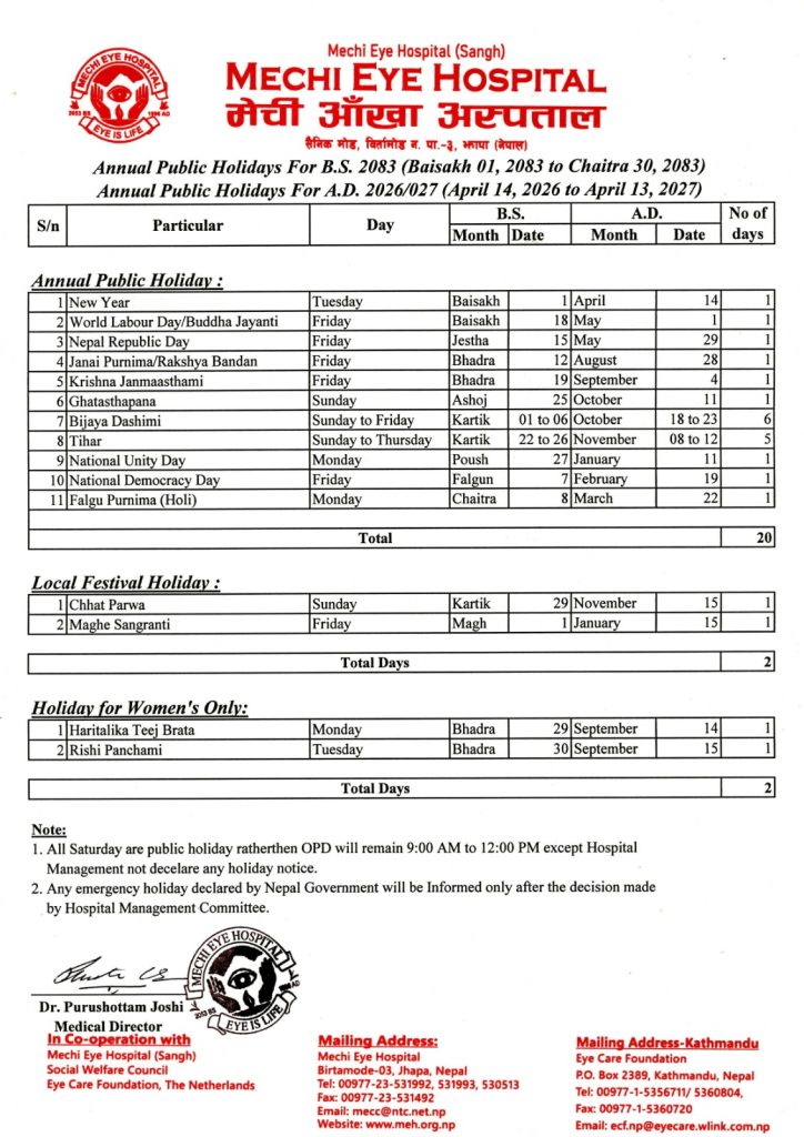 Please refer to the list of public holidays for 2083 BS (2026/27 AD) during which Mechi Eye Hospital will be closed, providing emergency services only.